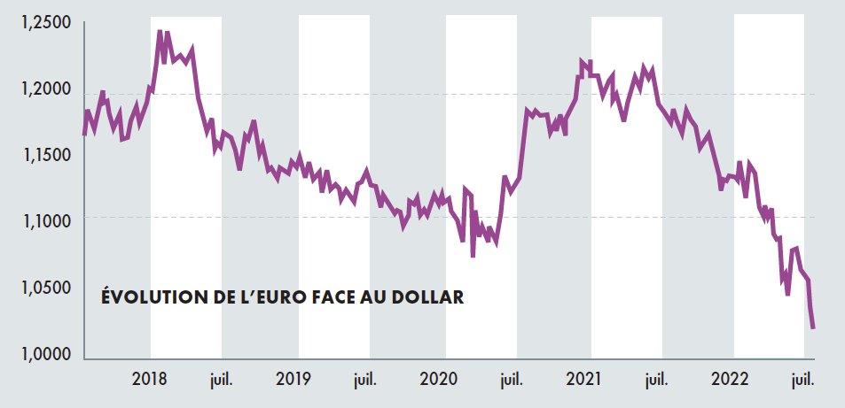 Du jamais vu depuis 20 ans ! Alors que les craintes autour d’une forte décélération de l’économie européenne, voire d’une récession, ne font que se renforcer, l’euro est retombé début juillet à 1 dollar. La monnaie unique valait encore 1,13 dollar fin 2021, et...