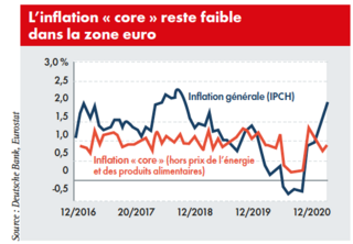 Une position justifiée aux yeux de nombreux économistes. Car au-delà du risque que ferait peser une augmentation rapide des taux d’intérêt de moyen et long termes sur les Etats, qui vont encore devoir emprunter massivement cette année pour financer leur plan de relance, mais aussi sur des entreprises déjà très endettées, la probabilité d’entrer dans une spirale inflationniste paraît faible. « La dynamique récente des prix...