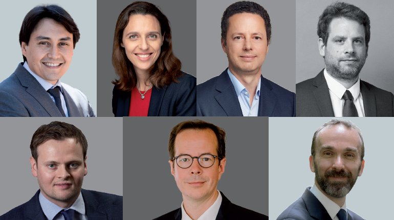 De gauche à droite et de haut en bas : Jean-Francis Dusch, directeur de la gestion en dette d’infrastructure, membre du comité exécutif, chez Edmond de Rothschild Asset Management ; Bérénice Arbona, responsable de l’équipe dette infrastructure de La Banque Postale Asset Management (LBPAM) ; Philippe Benaroya, directeur associé d’Infranity (Generali Investments) ; Alexis Sarrazin, directeur d’investissement et responsable de la gestion des fonds de dette de la plateforme infrastructure transition chez Schelcher Prince Gestion ; Benjamin Schmitt, responsable de la dette senior et junior en Europe pour les fonds et mandats de dette infrastructure de DWS ; Nicolas Boulet, directeur de la stratégie d’investissement d’Allianz France ; Jean-Christel Trabarel, associé gérant et fondateur de Jasmin Capital