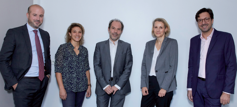 De gauche à droite : Baptiste Buisson, responsable des investissements mandats euro, ESG & solutions, Aviva Investors France, Anne-Sophie Musset, directrice R&D et climat chez Périclès Actuarial, Nicolas Fournier, directeur général de Sequantis LT, Muriel Heitzmann, directrice des investissements assurantiels chez Groupama Asset Management et membre du comité de direction, Edouard Jozan, responsable d’Allianz Insurance Asset Management, Allianz Global Investors