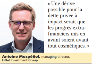 Signe de cette montée en puissance, de plus en plus de fonds de dette privée se structurent autour du concept d’impact. Premier à s’être lancé en juin 2019, Eiffel IG compte désormais deux véhicules fonctionnant sur ce principe. « Nous avons levé plus de 500 millions d’euros sur notre fonds Eiffel Impact Debt auprès d’une...