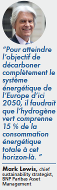 « Le rôle de l’hydrogène dans la transition énergétique est clé, explique Mark Lewis, chief sustainability strategist chez BNP Paribas Asset Management. Pour atteindre l’objectif de décarboner complètement le système énergétique de l’Europe d’ici 2050, il faudrait que l’hydrogène vert comprenne 15 % de la consommation énergétique totale à cet horizon-là. Pour y parvenir et devenir compétitif par rapport au pétrole et au gaz naturel, il faut néanmoins en baisser le coût de production et il faut que le prix du CO2 soit suffisamment élevé pour permettre la bascule de l’hydrogène gris à l’hydrogène vert dans l’industrie. »