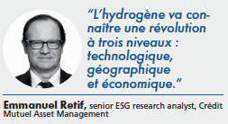 Les perspectives de l’hydrogène sont positives même si à l’heure actuelle cela ne correspond ni à une énergie verte ni à un marché de masse. « Nous pensons néanmoins que l’hydrogène va connaître une révolution à trois niveaux : technologique ; géographique (enjeu de souveraineté pour l’Europe et la France) ; économique », précise Emmanuel Retif, senior ESG research analyst chez Crédit Mutuel Asset Management. L’hydrogène offre des perspectives d’investissements intéressantes mais les défis à relever demeurent importants. Beaucoup d’opportunités se présentent aux investisseurs à la fois en amont (production) et en aval (stockage…).