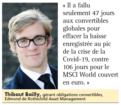 Il faut dire que 2020 aura été sans conteste une année exceptionnelle pour la classe d’actifs. « Au plus fort de la crise de la Covid-19, entre le 19 février 2020 et le 23 mars 2020, l’indice de référence des obligations convertibles européennes a amorti 72,5 % de la baisse de l’indice actions MSCI Europe, avec une performance de – 12,65 % contre – 45,89 %, détaille Thibaut Bailly, gérant obligations convertibles chez Edmond de Rothschild Asset Management. Après le 23 mars 2020, la convexité propre à l’instrument a permis de participer à la reprise des indices actions.