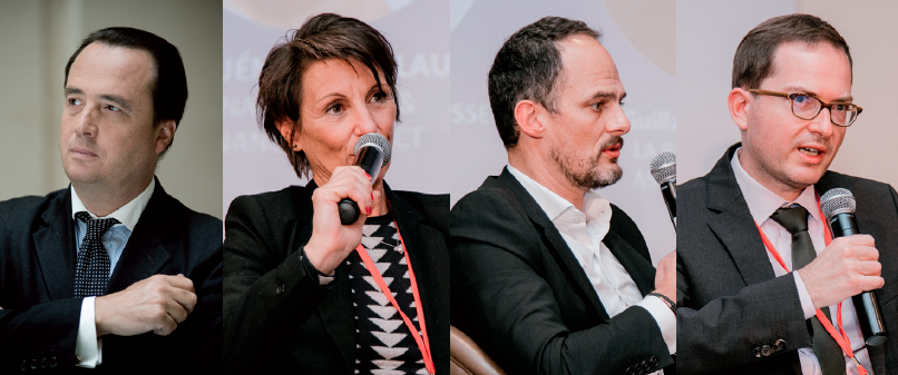 Avec de gauche à droite : Phillippe Dutertre (modérateur), directeur au sein de la direction des investissements & du financement, chargé de mission finance durable et rayonnement, AG2R La Mondiale, Isabelle Guénard-Malaussene, présidente du comité du label solidaire, Finansol-Fair et présidente, Finance@Impact ; Guillaume Lasserre, adjoint au directeur des gestions, La Banque Postale Asset Management ; Frédéric Pelèse, directeur adjoint - régulation et affaires internationales, AMF