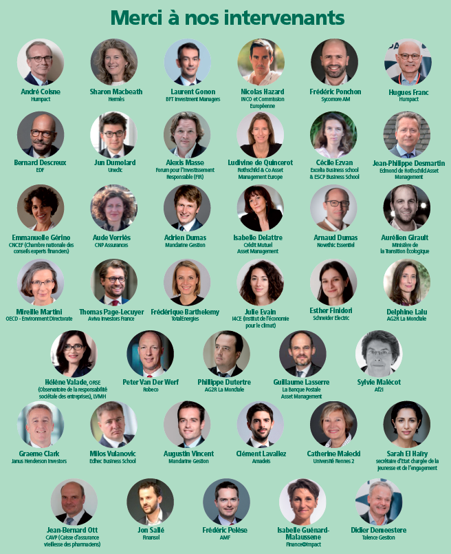 Avec de gauche à droite et de haut en bas : Frédérique Barthelemy, ESG Investors Relations Manager, TotalEnergies ; Julie Evain, cheffe de projet réglementation financière et climat, I4CE (Institut de l’économie pour le climat) ; Esther Finidori, VP Environment Strategy & Sustainability, Schneider Electric ; Delphine Lalu (modératrice), head of CSR and corporate philanthropy, Ag2r La Mondiale ; Hélène Valade, directrice développement environnement groupe, LVMH et présidente, ORSE (Observatoire de la responsabilité sociétale des entreprises) ; Peter Van Der Werf, Engagement Specialist, Robeco